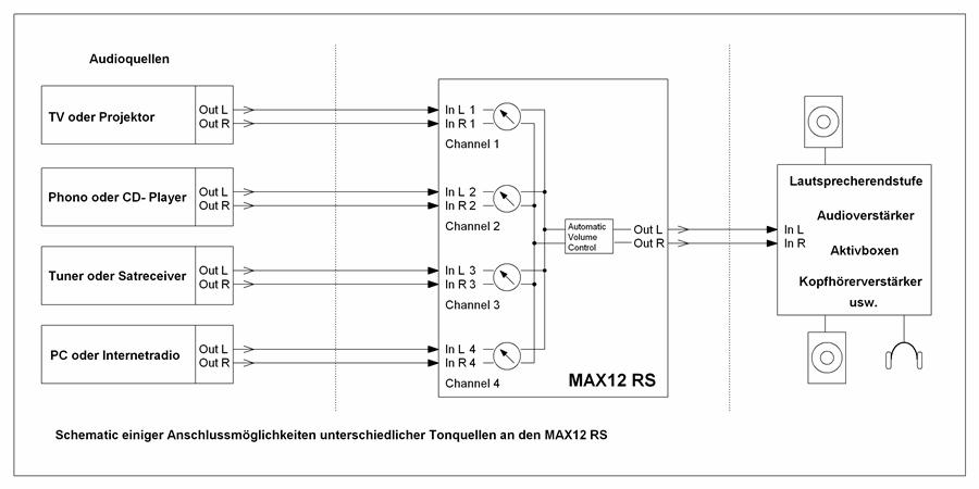 Der MAX12 RS verbindet alle Tonquellen Ihrer Audioanlage wie z.B. Computer, TV, Radio, Phono, CD-Player usw. und leitet diese an die gemeinsame Lautsprecheranlage weiter. Die zuschaltbare automatische Lautstärkeregelung regelt nicht nur alle angeschlossenen Audioquellen auf das gleiche Volumen, sondern regelt auch unterschiedlich laute Musiktitel auf eine einheitliche Lautstärke. Plötzlich eingespielte laute Werbung oder überlaute Schallereignisse werden in der Lautstärke sofort begrenzt, ohne die Tonqualität zu mindern.