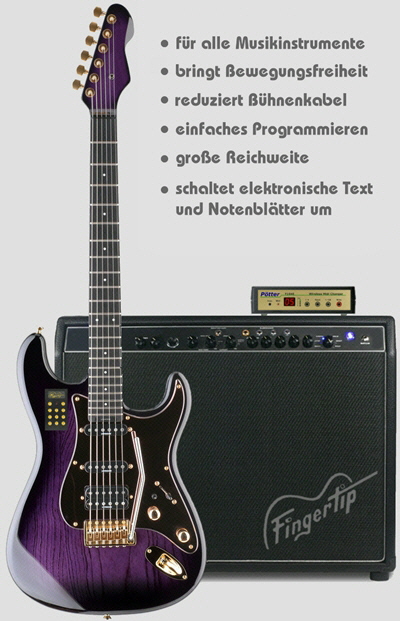 Die Fingertip Anlage besteht aus einem kleinen (66 x 37mm) Sendermodul F104S, welches mit leichtgängigen Präsisionstastern und taktiler Rückmeldung ausgestattetist. Von diesem Sender können 100 Programme des Empfängers F104E ausgewähltwerden. Die Übertragung erfolgt per Funk, mit einer Reichweite von etwa 300m. Einfache Befestigung auf fast jedes Instrument. Der Empfänger kann so programmiert werden, dass zu jedem vom Sender angewählten Programm (0-99) vier verschiedene MIDI-Change-Signale erzeugt und über vier getrennte MIDI- Ausgangsbuchsen ausgegeben werden können. Mit diesen Signalen lassen sich alle Geräte umschalten, welche über einen MIDI-Eingang verfügen und sich über das genormte MIDI-Change-Signal schalten lassen. Das können Gitarrenverstärker, Keyboards, Effektgeräte, Lichtmixer, Looper, Effektgeräte, Studiogeräte und Software (z.B. Cubase, Logic, usw.) sein. Natürlich ist es auch möglich den Fingertip mit Fußtastern und MIDI- Leisten zu kombinieren.