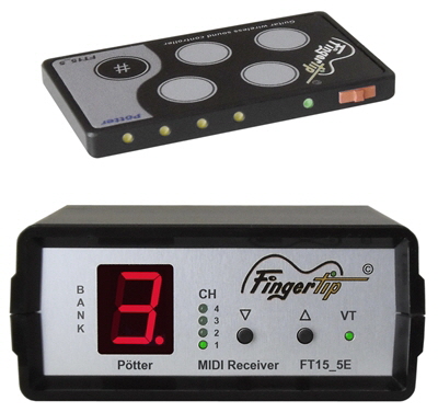 Die FT15_5 Anlage besteht aus dem speziell für Gitarren entwickelten Tastensender und einem Receiver mit integriertem MIDI Controller. Vom Tastensender aus, können 8 MIDI-Change Signale auf 10 ausgewählten Bänken gesendet werden. Die Übertragung erfolgt über eine sichere Funkverbindung, mit einer Reichweite von bis zu 150m. Der angewählte Changebefehl wird an der Seite des Tastensenders gut sichtbar von farbigen LEDs angezeigt.