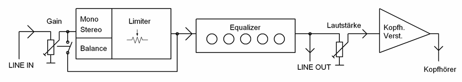 Technische Daten: Frequenzumfang 20Hz – 25Khz, Power 12 Volt DC, Endstufe 2x 1000 mW, Line-Out 0,775 mV, Equalizer pro Frequenzband Anhebung / Absenkung +/- 15db, Metallgehäuse, Audio-Anschlussbuchsen 3,5mm Klinke. Kopfhörerimpedanz 8 - 120 Ohm, Maße 110 x 100 x 25mm.